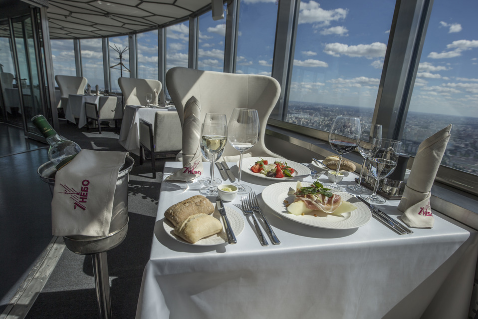 Над смотровой площадкой расположено легендарное «Седьмое небо». Особенностью ресторана является вращающийся пол, благодаря чему буквально за 40 минут посетители «Седьмого неба» смогут совершить оборот в 360 градусов и увидеть Москву со всех сторон.